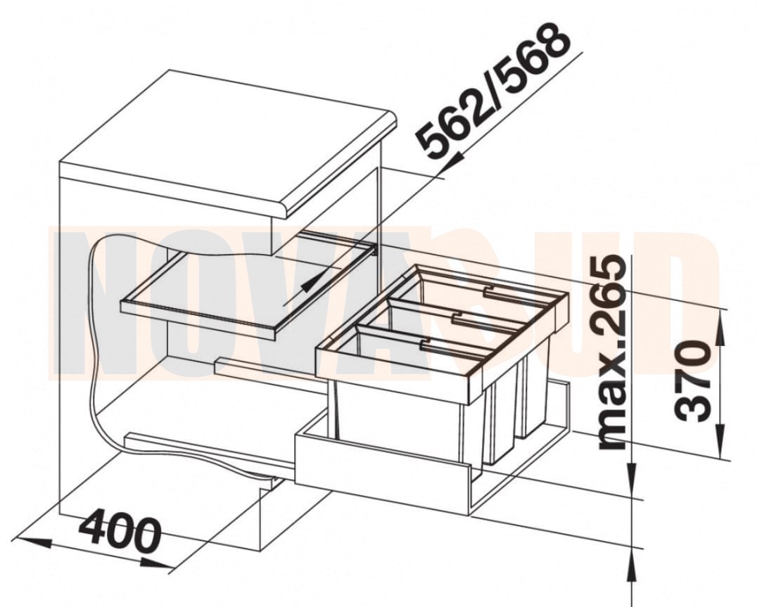 - Wysokość montażowa 355 mm nad dnem szuflady, wysokość montażowa bez pokrywy systemowej 325 mm nad dnem szuflady, głębokość montażowa 400 mm (wymiary wewnętrzne szuflady).