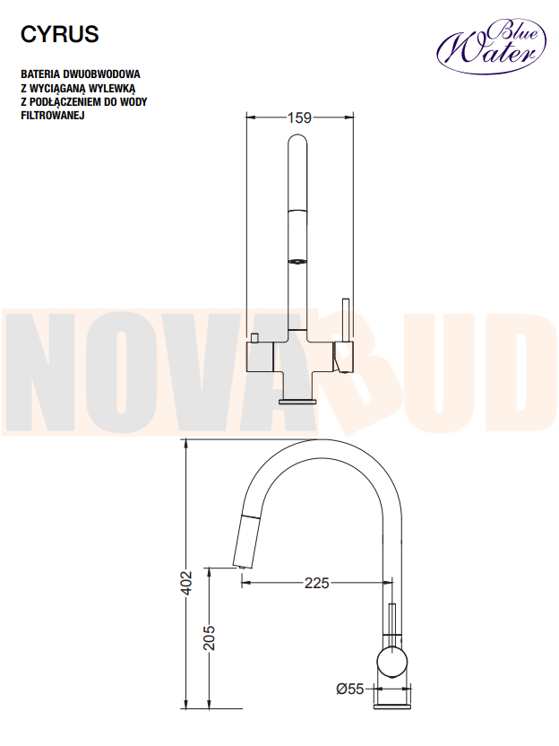 Blue Water Cyrus CZARNY MAT bat.kuchenna z pod.do wody filtrowanej z wyc.wyl dwuobwodowa 5901730616606