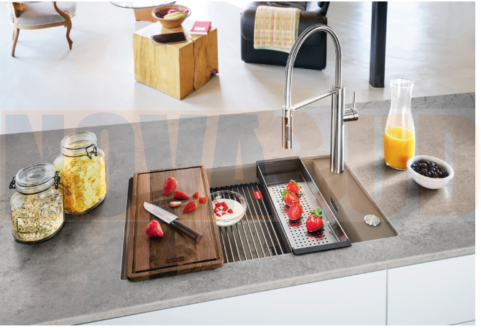 Komora do podbudowy z linii Kanon KNG 110-62 w zestawie zawiera wkładę ociekową i rollmatę oraz korek automatyczny Flow Pro, sterowany przyciskiem Easy Click w wykończeniu ze stali szlachetnej. Dzięki specjalnie zaprojektowanej krawędzi wewnętrznej, można komfortowo korzystać z akcesoriów na dwóch poziomach pracy. Zlewozmywak wyprodukowany jest z Fragranitu +, który jest materiałem wyprodukowanym w 80% z naturalnego granitu.Dzięki zastosowaniu bardzo drobnych cząsteczek granitu, uzyskano zlewozmywak idealnie gładki i delikatny w dotyku. Wszystkie zlewozmywaki fragranitowe FRANKE, wyprodukowane są z wykorzystaniem technologii Sanitized®. Zawierają zatem szkło fosforanowe z dodatkiem srebra, ograniczającym rozwój bakterii do 99%. Wszystkie zlewozmywaki z Fragranitu+ są odporne na zarysowania, uderzenia i zaplamienie, a ich kolor nie zmienia się z upływem czasu. Są również odporne na krótkotrwałe działanie wysokiej temperatury (do 280°C przez 15 sek.).