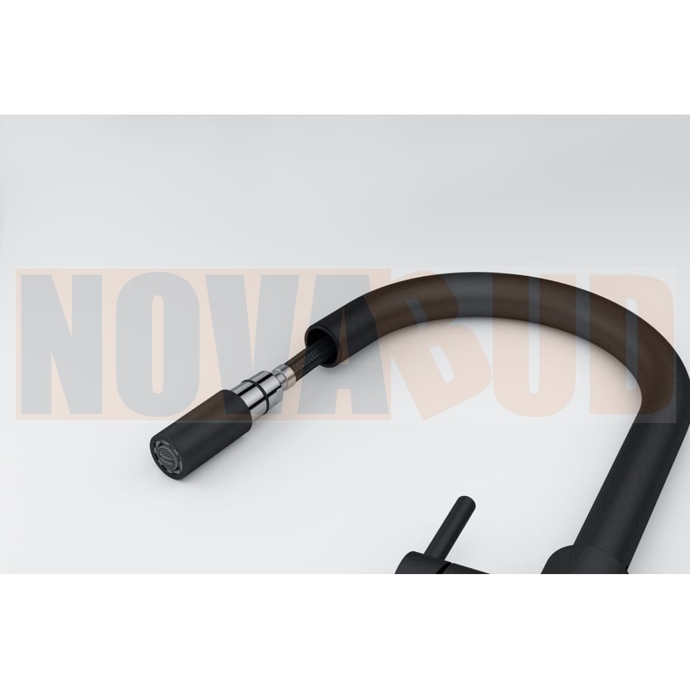 Bateria kuchenna z wyciąganą wylewką Lina Pull-out w kolorze onyx o minimalistycznym i nowoczesnym wzornictwie. Posiada ceramiczną głowicę, która charakteryzuje się wyjątkową trwałością i odpornością na uszkodzenia, a jej zakres ruchu dźwigni mieszacza pozwala na montaż blisko ściany.