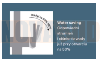 baterię wyborem przyjaznym dla środowiska. Głowica ECO water saving : dwustopniowa głowica pomaga zmniejszyć zużycie wody, jednocześnie zapewniając optymalny przepływ wody. Dźwignia mieszacza w czasie uruchamiania otwiera się do połowy, ograniczając w naturalny sposób przepływ wody. Jeśli potrzebujemy większy strumień, należy dźwignię przechylić mocniej, wtedy głowica otwiera się całkowicie.